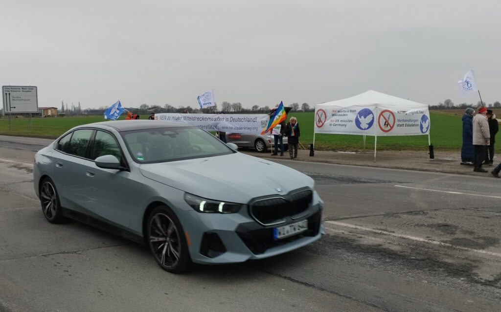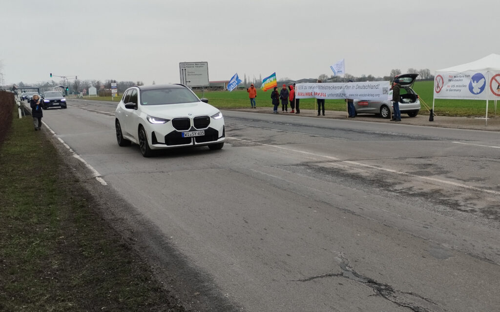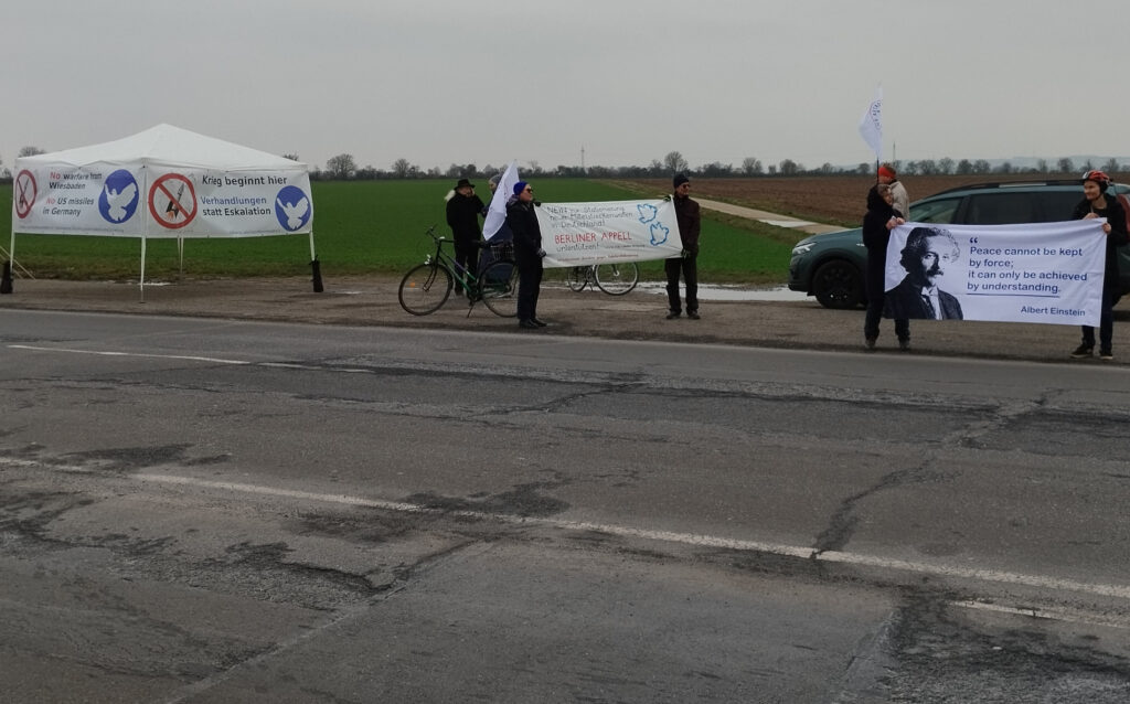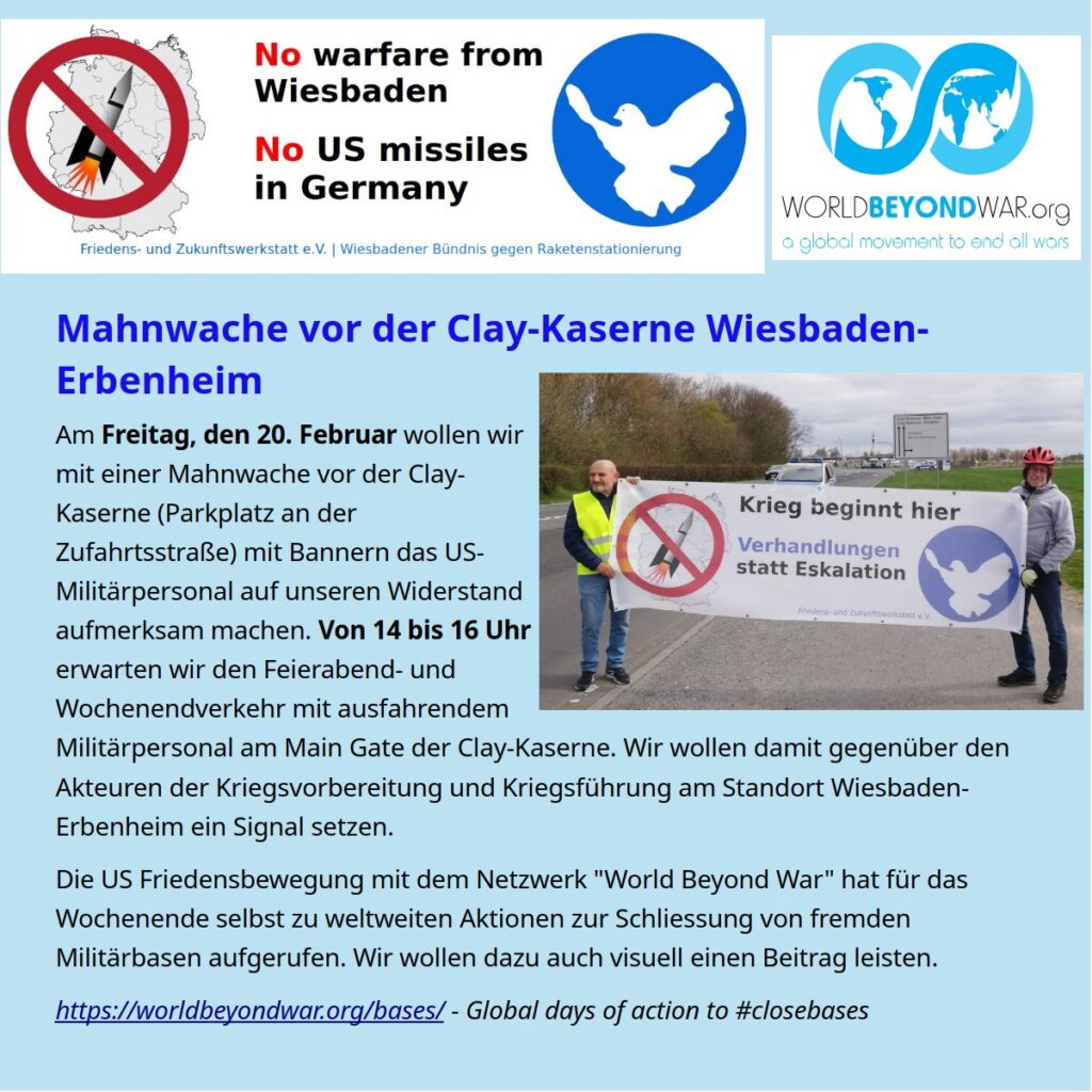 Am Freitag, den 20. Februar haben wir gemeinsam mit der Friedens- und Zukunftswerkstatt Frankfurt bei einer Mahnwache vor der Clay-Kaserne (Parkplatz an der Zufahrtsstraße) mit Bannern das US-Militärpersonal auf unseren Widerstand aufmerksam gemacht. Zwei Stunden lang haben wir der Kälte trotzend von 14 bis 16 Uhr gut sichtbar für den sehr dichten Feierabend- und Wochenendverkehr mit zumeist ausfahrendem Militärpersonal am Main Gate der Clay-Kaserne „Flagge gezeigt“. Wir haben damit gegenüber den Akteuren der Kriegsvorbereitung und Kriegsführung am Standort Wiesbaden-Erbenheim ein Signal gesetzt. Viele Autofahrer haben uns im Vorbeifahren dabei auch freundlich zugewunken.